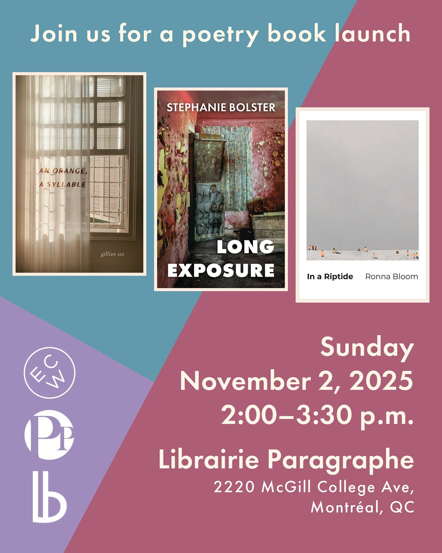 Sunday Nov 2 @ 2:00pm Catch Stephanie Bolster at Paragraphe Bookstore for the launch of her newest poetry collection LONG EXPOSURE. Guest readers include Ronna Bloom