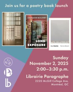 Catch Stephanie Bolster at Paragraphe Bookstore for the launch of her newest poetry collection LONG EXPOSURE. Guest readers include Ronna Bloom and Gillian Sze.