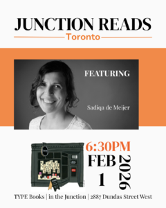 Everyone is welcome. Masking is always appreciated. Junction Reads takes place at Type Books at the Junction, 2887 Dundas St W, Toronto,  We hope to see you there!