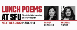 Catch Sadiqa de Meijer author of ALFABET/ALPHABET and IN THE FIELD at Lunch Poems at SFU with Theresa Muñoz. Lunch Poems at SFU is a unique opportunity to celebrate poetry and is held the third Wednesday of every month, from 12 p.m. to 1 p.m. Books will be available for sale.