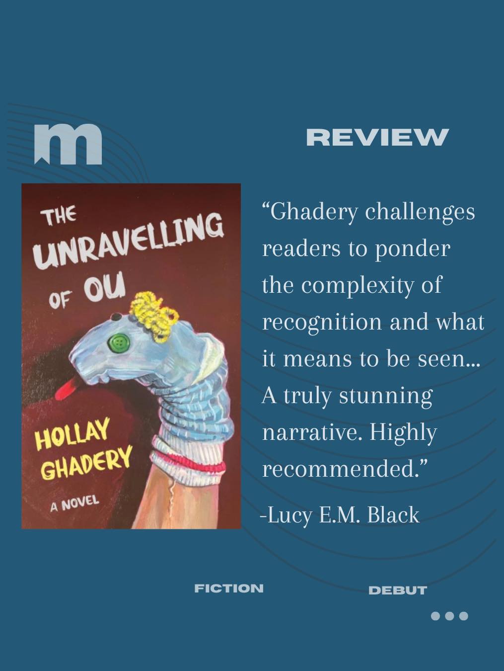 Many thanks to Lucy M. Black for this thoughtful and engaged review of Hollay Ghadery’s new debut novel THE UNRAVELLING OF OU. “Beautifully told with her trademark