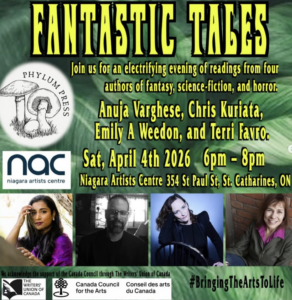 Catch SACRIFICE OF THE SISTERS LOT author Chris Kuriata at The niagara Artists Centre for Fantastic Tales, an electrifying evening of reading from four authors of fantasy, science-fiction and horror. With guest readers Anuja Varghese, Emily A Weedon and Terri Favro. Books will be for sale. Stop by and get a signed copy!