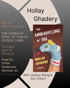 Join Hollay Ghadery at Blue Metropolis for the panel discussion The Power of Point of View in Divisive Times with Sky Gilbert and Lindsay Wong, moderated by Gina Leola Woolsey.