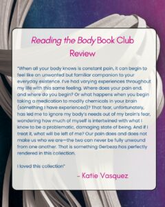 “When all your body knows is constant pain, it can begin to feel like an unwanted but familiar companion to your everyday existence. I’ve had varying experiences throughout my life with this same feeling. Where does your pain end, and where do you begin? Or what happens when you begin taking a medication to modify chemicals in your brain (something I have experienced)? That fear, unfortunately, has led me to ignore my body’s needs out of my brain’s fear, wondering how much of myself is intertwined with what I know to be a problematic, damaging state of being. And if I treat it, what will be left of me? Our pain does and does not make us who we are—the two can never be fully unwound from one another. That is something Gerbeza has perfectly rendered in this collection.I loved this collection”- Katie Vasquez